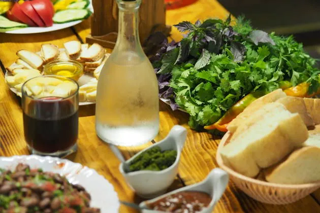 Различные виды хлеба: дрожжевой (пури) и без дрожжевой лаваш, «пастэ» — адыгейская кукурузная мамалыга, грузинское лоббио, овощи и сыр (адыгейский и сулугуни — домашнего приготовления), абхазская аджика и соус ткемали, шашлык и т.д. и конечно же вино нескольких сортов, коньяк и чача. Безалкогольные напитки.