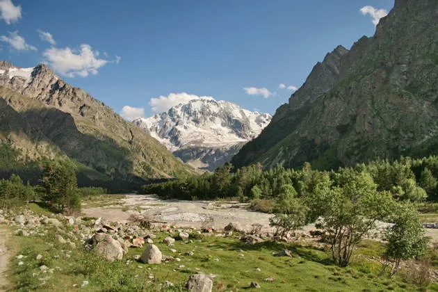 По ущелью Адыр-Су к альплагерямПреодолев перевал, мы окажемся в ущелье Адыр-Су. Название ущелья буквально переводится как «река с хребта». Многие считают это ущелье — самым живописным на Северном Кавказе. Ущелье отличается действительно разнообразным миром растений. По мнению некоторых исследователей, число культур здесь достигает 3000 видов: начало ущелья славится красивыми хвойными лесами, в некоторых местах вперемешку с лиственными деревьями, чаще березами.
